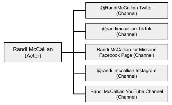 Nuestro actor será Randi McCallian, candidata para la Cámara de Representantes de EE.UU. en 2024. McCallian tiene 5 canales que están siendo monitoreados en Junkipedia: cuentas en Twitter, Facebook, TikTok, YouTube e Instagram.