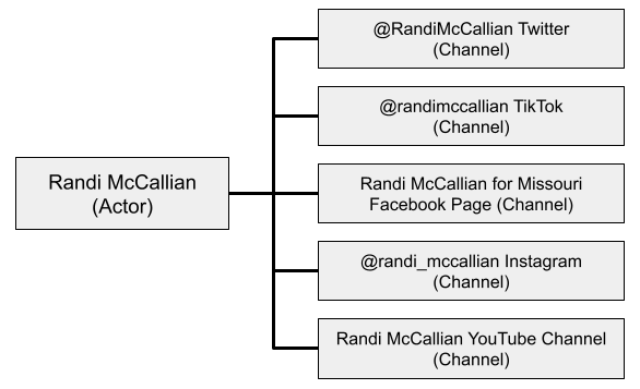 Nuestro actor será Randi McCallian, candidata para la Cámara de Representantes de EE.UU. en 2024. McCallian tiene 5 canales que están siendo monitoreados en Junkipedia: cuentas en Twitter, Facebook, TikTok, YouTube e Instagram.