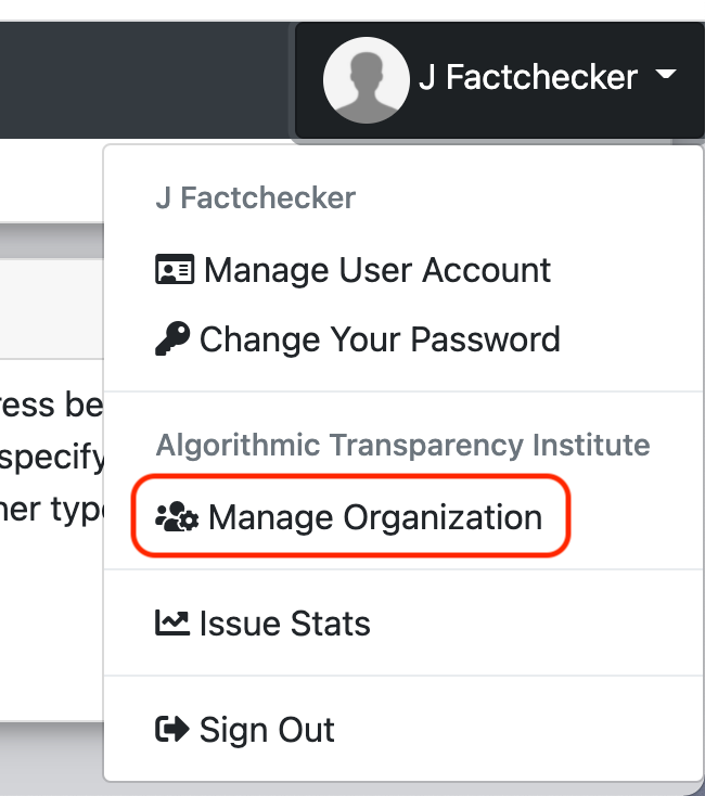 Una vez que hayas iniciado sesión en Junkipedia, haz clic en el ícono de tu perfil en la esquina superior derecha de tu pantalla y luego haz clic en "Manage organization" (Administrar la organización).