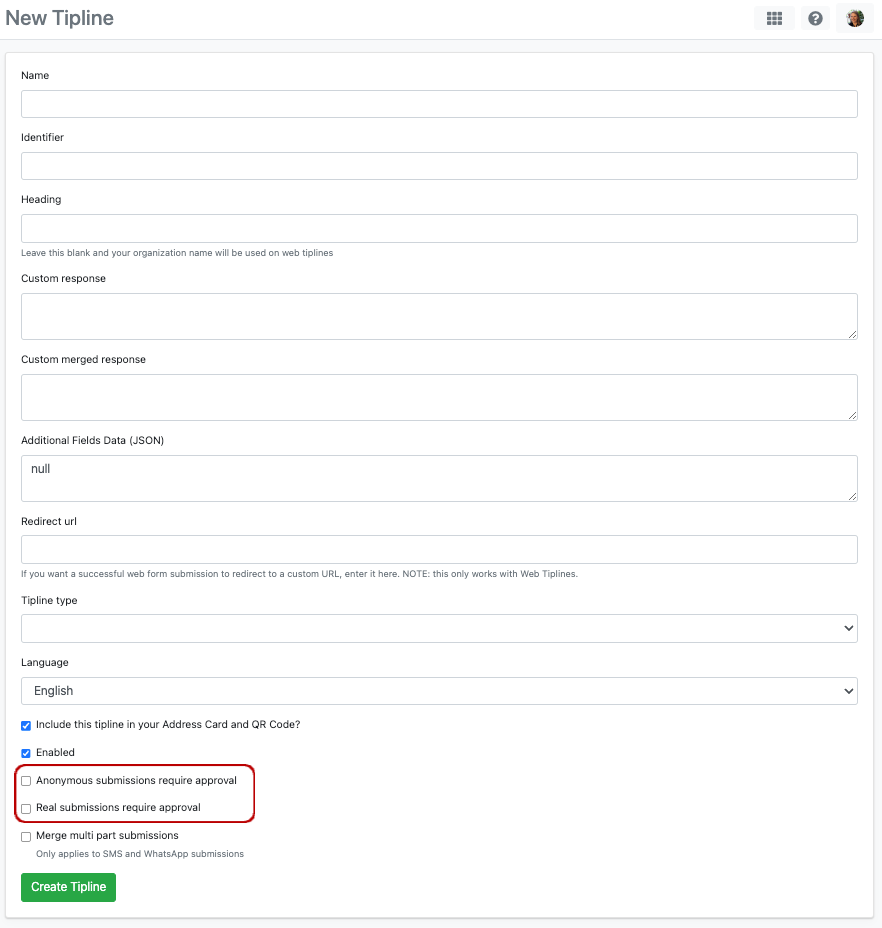 Los formularios "New Tipline" (Nuevo canal de reportes) y "Edit Tipline" (Editar canal de reportes) son similares al ejemplo que se muestra a continuación. El requisito de revisión se puede configurar de manera independiente para reportes anónimos o para reportes enviados por usuarios identificados.