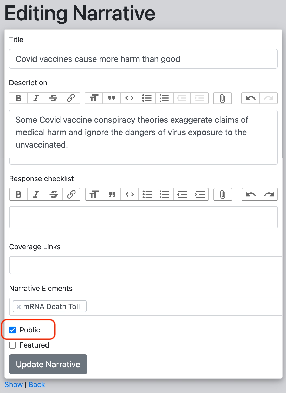 Si tienes los privilegios suficientes para hacer una narrativa pública para los usuarios de Junkipedia fuera de tu organización y red, verás una casilla de verificación etiquetada como "Public" (Público) cerca de la parte inferior de la página de edición de narrativas. Si esta casilla no aparece, no tienes permisos para cambiar la configuración pública de esta narrativa.